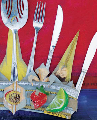 Feeding the hungry upscale Southern cuisine – while giving some staff members a fresh chance at life. This is what Karen Noble and husband, Jim, a celebrated chef in Charlotte, N.C., have spent their entire careers doing. A full page illustration was commissioned for this article in More LIVING magazine. I wanted to use real silverware to create a crown out of – However, due to the scale and size of the tableware, I had to construct the image on a very large canvas. Collage and mixed media.